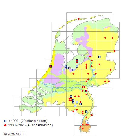 Het aantal atlasblokken (5x5 km) waarin de soort is gemeld binnen een periode van vijf jaar (vanaf 1980) of twintig jaar. Niet gecorrigeerd voor waarnemersinspanning en het aantal doorgegeven waarnemingen kan sterk variëren per periode, dus een trend in verspreiding kan hier niet direct uit worden afgelezen. Het opgegeven jaartal is het eerste jaar van de periode. Bron: gevalideerde waarnemingen uit de NDFF.