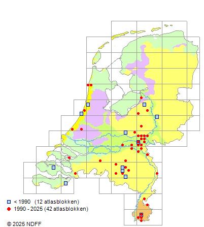 Het aantal atlasblokken (5x5 km) waarin de soort is gemeld binnen een periode van vijf jaar (vanaf 1980) of twintig jaar. Niet gecorrigeerd voor waarnemersinspanning en het aantal doorgegeven waarnemingen kan sterk variëren per periode, dus een trend in verspreiding kan hier niet direct uit worden afgelezen. Het opgegeven jaartal is het eerste jaar van de periode. Bron: gevalideerde waarnemingen uit de NDFF.