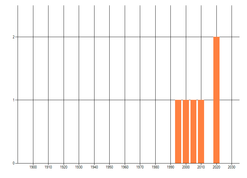 Het aantal atlasblokken (5x5 km) waarin de soort is gemeld binnen een periode van vijf jaar (vanaf 1980) of twintig jaar. Niet gecorrigeerd voor waarnemersinspanning en het aantal doorgegeven waarnemingen kan sterk variëren per periode, dus een trend in verspreiding kan hier niet direct uit worden afgelezen. Het opgegeven jaartal is het eerste jaar van de periode. Bron: gevalideerde waarnemingen uit de NDFF.