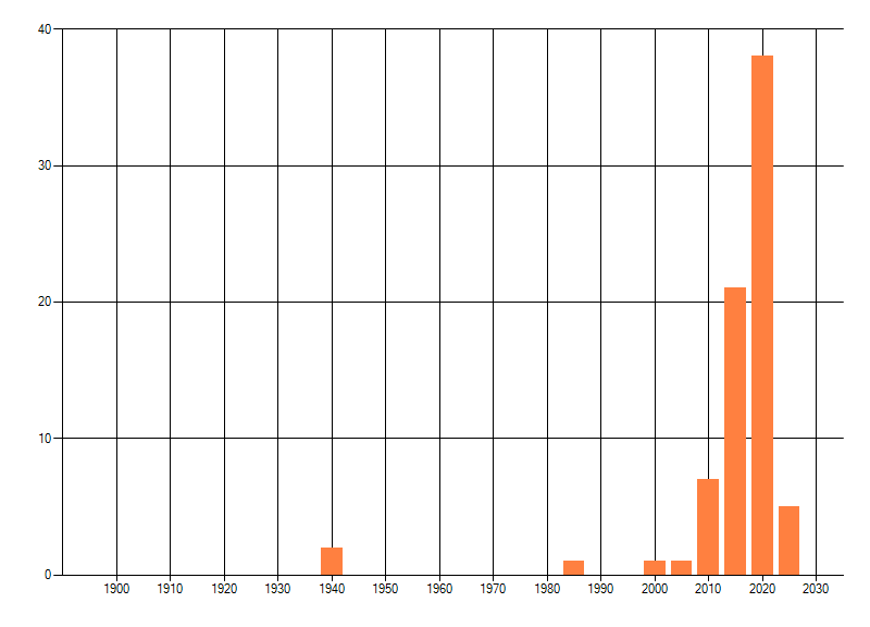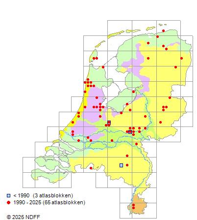 Het aantal atlasblokken (5x5 km) waarin de soort is gemeld binnen een periode van vijf jaar (vanaf 1980) of twintig jaar. Niet gecorrigeerd voor waarnemersinspanning en het aantal doorgegeven waarnemingen kan sterk variëren per periode, dus een trend in verspreiding kan hier niet direct uit worden afgelezen. Het opgegeven jaartal is het eerste jaar van de periode. Bron: gevalideerde waarnemingen uit de NDFF.