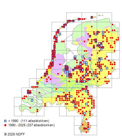 Het aantal atlasblokken (5x5 km) waarin de soort is gemeld binnen een periode van vijf jaar (vanaf 1980) of twintig jaar. Niet gecorrigeerd voor waarnemersinspanning en het aantal doorgegeven waarnemingen kan sterk variƫren per periode, dus een trend in verspreiding kan hier niet direct uit worden afgelezen. Het opgegeven jaartal is het eerste jaar van de periode. Bron: gevalideerde waarnemingen uit de NDFF.