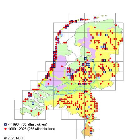 Het aantal atlasblokken (5x5 km) waarin de soort is gemeld binnen een periode van vijf jaar (vanaf 1980) of twintig jaar. Niet gecorrigeerd voor waarnemersinspanning en het aantal doorgegeven waarnemingen kan sterk variëren per periode, dus een trend in verspreiding kan hier niet direct uit worden afgelezen. Het opgegeven jaartal is het eerste jaar van de periode. Bron: gevalideerde waarnemingen uit de NDFF.