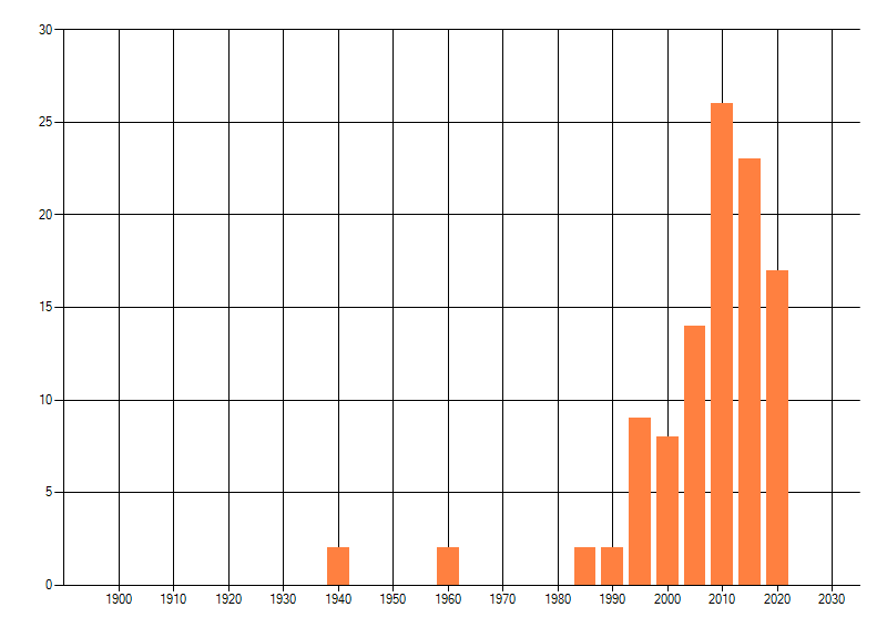 Het aantal atlasblokken (5x5 km) waarin de soort is gemeld binnen een periode van vijf jaar (vanaf 1980) of twintig jaar. Niet gecorrigeerd voor waarnemersinspanning en het aantal doorgegeven waarnemingen kan sterk variëren per periode, dus een trend in verspreiding kan hier niet direct uit worden afgelezen. Het opgegeven jaartal is het eerste jaar van de periode. Bron: gevalideerde waarnemingen uit de NDFF.