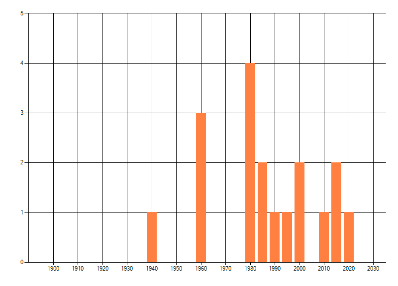 Het aantal atlasblokken (5x5 km) waarin de soort is gemeld binnen een periode van vijf jaar (vanaf 1980) of twintig jaar. Niet gecorrigeerd voor waarnemersinspanning en het aantal doorgegeven waarnemingen kan sterk variëren per periode, dus een trend in verspreiding kan hier niet direct uit worden afgelezen. Het opgegeven jaartal is het eerste jaar van de periode. Bron: gevalideerde waarnemingen uit de NDFF.
