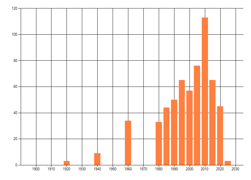 Het aantal atlasblokken (5x5 km) waarin de soort is gemeld binnen een periode van vijf jaar (vanaf 1980) of twintig jaar. Niet gecorrigeerd voor waarnemersinspanning en het aantal doorgegeven waarnemingen kan sterk variëren per periode, dus een trend in verspreiding kan hier niet direct uit worden afgelezen. Het opgegeven jaartal is het eerste jaar van de periode. Bron: gevalideerde waarnemingen uit de NDFF.