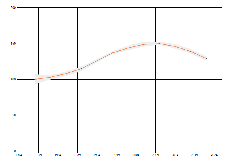 Gemiddelde trend van het aantal kilometerhokken waarin de soort voorkomt, weergegeven als indexcijfer (1975-1978 = 100).