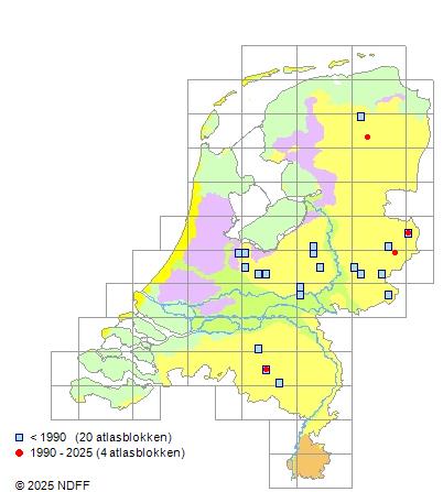 Het aantal atlasblokken (5x5 km) waarin de soort is gemeld binnen een periode van vijf jaar (vanaf 1980) of twintig jaar. Niet gecorrigeerd voor waarnemersinspanning en het aantal doorgegeven waarnemingen kan sterk variëren per periode, dus een trend in verspreiding kan hier niet direct uit worden afgelezen. Het opgegeven jaartal is het eerste jaar van de periode. Bron: gevalideerde waarnemingen uit de NDFF.