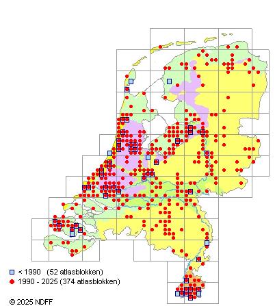 Het aantal atlasblokken (5x5 km) waarin de soort is gemeld binnen een periode van vijf jaar (vanaf 1980) of twintig jaar. Niet gecorrigeerd voor waarnemersinspanning en het aantal doorgegeven waarnemingen kan sterk variëren per periode, dus een trend in verspreiding kan hier niet direct uit worden afgelezen. Het opgegeven jaartal is het eerste jaar van de periode. Bron: gevalideerde waarnemingen uit de NDFF.