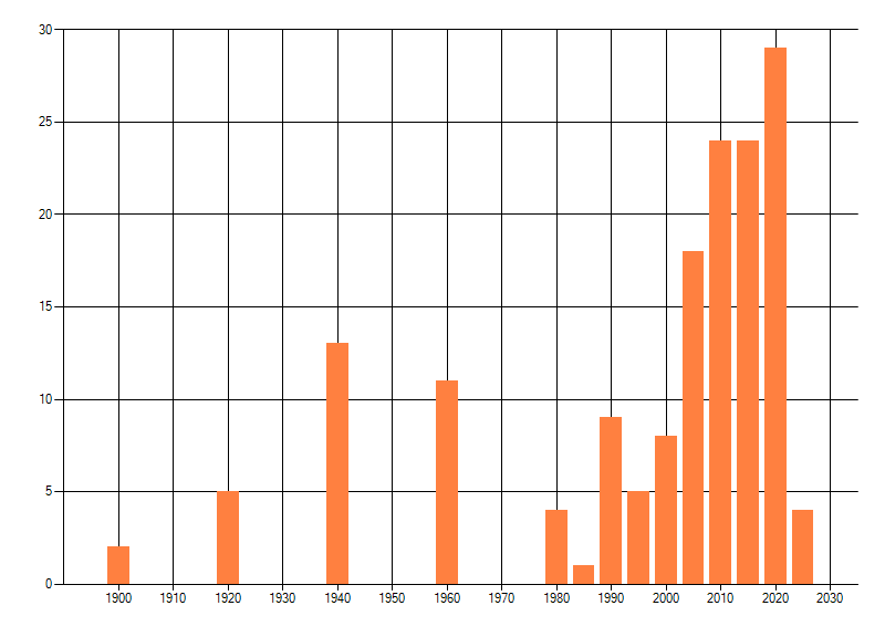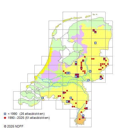 Het aantal atlasblokken (5x5 km) waarin de soort is gemeld binnen een periode van vijf jaar (vanaf 1980) of twintig jaar. Niet gecorrigeerd voor waarnemersinspanning en het aantal doorgegeven waarnemingen kan sterk variëren per periode, dus een trend in verspreiding kan hier niet direct uit worden afgelezen. Het opgegeven jaartal is het eerste jaar van de periode. Bron: gevalideerde waarnemingen uit de NDFF.