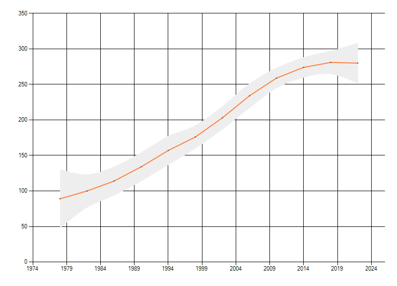 Gemiddelde trend van het aantal kilometerhokken waarin de soort voorkomt, weergegeven als indexcijfer (1975-1978 = 100). De trend is gecorrigeerd voor waarnemersinspanning en geeft de relatieve verandering in het aantal bezette kilometerhokken weer. Voor de berekening worden de data per periode van vier jaar samengenomen. In de grafiek correspondeert ieder punt met het laatste jaar van zo'n periode.