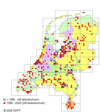 Het aantal atlasblokken (5x5 km) waarin de soort is gemeld binnen een periode van vijf jaar (vanaf 1980) of twintig jaar. Niet gecorrigeerd voor waarnemersinspanning en het aantal doorgegeven waarnemingen kan sterk variëren per periode, dus een trend in verspreiding kan hier niet direct uit worden afgelezen. Het opgegeven jaartal is het eerste jaar van de periode. Bron: gevalideerde waarnemingen uit de NDFF.