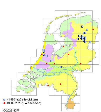 Het aantal atlasblokken (5x5 km) waarin de soort is gemeld binnen een periode van vijf jaar (vanaf 1980) of twintig jaar. Niet gecorrigeerd voor waarnemersinspanning en het aantal doorgegeven waarnemingen kan sterk variëren per periode, dus een trend in verspreiding kan hier niet direct uit worden afgelezen. Het opgegeven jaartal is het eerste jaar van de periode. Bron: gevalideerde waarnemingen uit de NDFF.