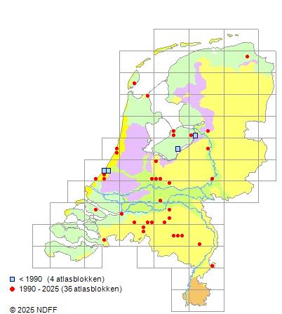 Het aantal atlasblokken (5x5 km) waarin de soort is gemeld binnen een periode van vijf jaar (vanaf 1980) of twintig jaar. Niet gecorrigeerd voor waarnemersinspanning en het aantal doorgegeven waarnemingen kan sterk variëren per periode, dus een trend in verspreiding kan hier niet direct uit worden afgelezen. Het opgegeven jaartal is het eerste jaar van de periode. Bron: gevalideerde waarnemingen uit de NDFF.