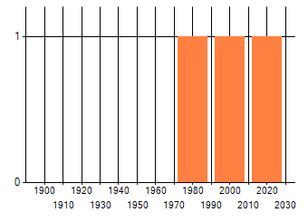 Het aantal atlasblokken (5x5 km) waarin de soort is gemeld binnen een periode van vijf jaar (vanaf 1980) of twintig jaar. Niet gecorrigeerd voor waarnemersinspanning en het aantal doorgegeven waarnemingen kan sterk variëren per periode, dus een trend in verspreiding kan hier niet direct uit worden afgelezen. Het opgegeven jaartal is het eerste jaar van de periode. Bron: gevalideerde waarnemingen uit de NDFF.