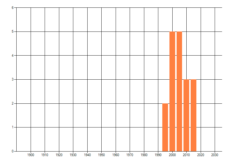 Het aantal atlasblokken (5x5 km) waarin de soort is gemeld binnen een periode van vijf jaar (vanaf 1980) of twintig jaar. Niet gecorrigeerd voor waarnemersinspanning en het aantal doorgegeven waarnemingen kan sterk variëren per periode, dus een trend in verspreiding kan hier niet direct uit worden afgelezen. Het opgegeven jaartal is het eerste jaar van de periode. Bron: gevalideerde waarnemingen uit de NDFF.