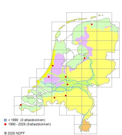 Het aantal atlasblokken (5x5 km) waarin de soort is gemeld binnen een periode van vijf jaar (vanaf 1980) of twintig jaar. Niet gecorrigeerd voor waarnemersinspanning en het aantal doorgegeven waarnemingen kan sterk variëren per periode, dus een trend in verspreiding kan hier niet direct uit worden afgelezen. Het opgegeven jaartal is het eerste jaar van de periode. Bron: gevalideerde waarnemingen uit de NDFF.