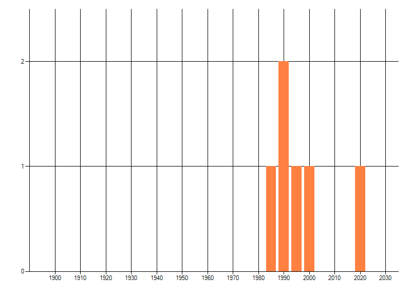 Het aantal atlasblokken (5x5 km) waarin de soort is gemeld binnen een periode van vijf jaar (vanaf 1980) of twintig jaar. Niet gecorrigeerd voor waarnemersinspanning en het aantal doorgegeven waarnemingen kan sterk variëren per periode, dus een trend in verspreiding kan hier niet direct uit worden afgelezen. Het opgegeven jaartal is het eerste jaar van de periode. Bron: gevalideerde waarnemingen uit de NDFF.