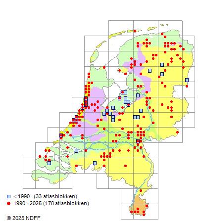 Het aantal atlasblokken (5x5 km) waarin de soort is gemeld binnen een periode van vijf jaar (vanaf 1980) of twintig jaar. Niet gecorrigeerd voor waarnemersinspanning en het aantal doorgegeven waarnemingen kan sterk variëren per periode, dus een trend in verspreiding kan hier niet direct uit worden afgelezen. Het opgegeven jaartal is het eerste jaar van de periode. Bron: gevalideerde waarnemingen uit de NDFF.