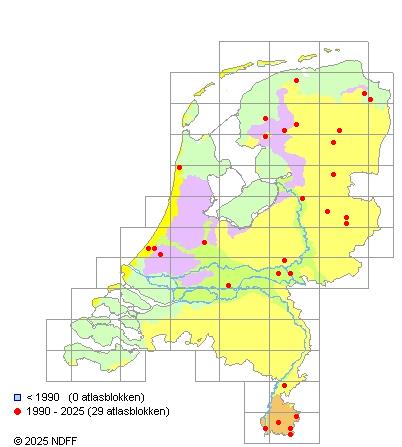 Het aantal atlasblokken (5x5 km) waarin de soort is gemeld binnen een periode van vijf jaar (vanaf 1980) of twintig jaar. Niet gecorrigeerd voor waarnemersinspanning en het aantal doorgegeven waarnemingen kan sterk variëren per periode, dus een trend in verspreiding kan hier niet direct uit worden afgelezen. Het opgegeven jaartal is het eerste jaar van de periode. Bron: gevalideerde waarnemingen uit de NDFF.