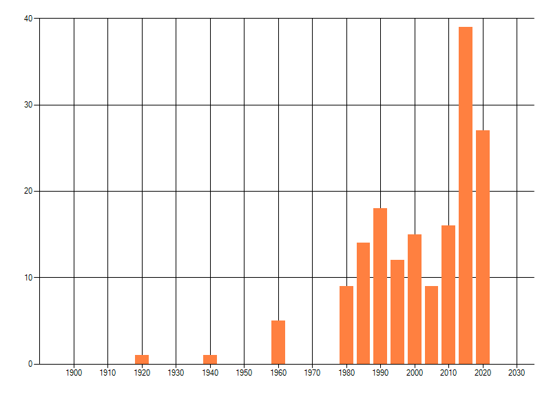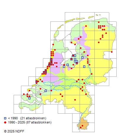 Het aantal atlasblokken (5x5 km) waarin de soort is gemeld binnen een periode van vijf jaar (vanaf 1980) of twintig jaar. Niet gecorrigeerd voor waarnemersinspanning en het aantal doorgegeven waarnemingen kan sterk variëren per periode, dus een trend in verspreiding kan hier niet direct uit worden afgelezen. Het opgegeven jaartal is het eerste jaar van de periode. Bron: gevalideerde waarnemingen uit de NDFF.