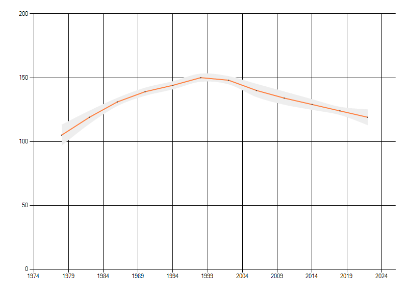 Gemiddelde trend van het aantal kilometerhokken waarin de soort voorkomt, weergegeven als indexcijfer (1975-1978 = 100). De trend is gecorrigeerd voor waarnemersinspanning en geeft de relatieve verandering in het aantal bezette kilometerhokken weer. Voor de berekening worden de data per periode van vier jaar samengenomen. In de grafiek correspondeert ieder punt met het laatste jaar van zo'n periode.