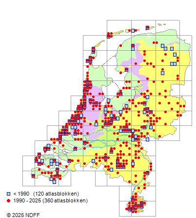 Het aantal atlasblokken (5x5 km) waarin de soort is gemeld binnen een periode van vijf jaar (vanaf 1980) of twintig jaar. Niet gecorrigeerd voor waarnemersinspanning en het aantal doorgegeven waarnemingen kan sterk variëren per periode, dus een trend in verspreiding kan hier niet direct uit worden afgelezen. Het opgegeven jaartal is het eerste jaar van de periode. Bron: gevalideerde waarnemingen uit de NDFF.