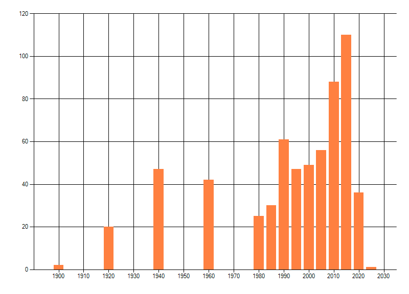 Het aantal atlasblokken (5x5 km) waarin de soort is gemeld binnen een periode van vijf jaar (vanaf 1980) of twintig jaar. Niet gecorrigeerd voor waarnemersinspanning en het aantal doorgegeven waarnemingen kan sterk variëren per periode, dus een trend in verspreiding kan hier niet direct uit worden afgelezen. Het opgegeven jaartal is het eerste jaar van de periode. Bron: gevalideerde waarnemingen uit de NDFF.