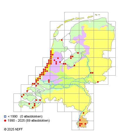 Het aantal atlasblokken (5x5 km) waarin de soort is gemeld binnen een periode van vijf jaar (vanaf 1980) of twintig jaar. Niet gecorrigeerd voor waarnemersinspanning en het aantal doorgegeven waarnemingen kan sterk variëren per periode, dus een trend in verspreiding kan hier niet direct uit worden afgelezen. Het opgegeven jaartal is het eerste jaar van de periode. Bron: gevalideerde waarnemingen uit de NDFF.