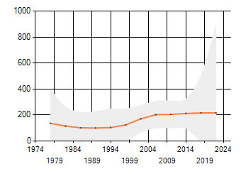Gemiddelde trend van het aantal kilometerhokken waarin de soort voorkomt, weergegeven als indexcijfer (1975-1978 = 100).