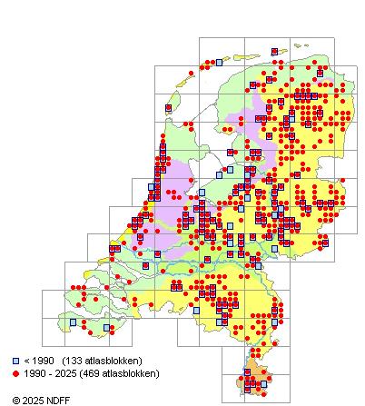 Het aantal atlasblokken (5x5 km) waarin de soort is gemeld binnen een periode van vijf jaar (vanaf 1980) of twintig jaar. Niet gecorrigeerd voor waarnemersinspanning en het aantal doorgegeven waarnemingen kan sterk variëren per periode, dus een trend in verspreiding kan hier niet direct uit worden afgelezen. Het opgegeven jaartal is het eerste jaar van de periode. Bron: gevalideerde waarnemingen uit de NDFF.