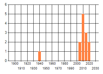 Het aantal atlasblokken (5x5 km) waarin de soort is gemeld binnen een periode van vijf jaar (vanaf 1980) of twintig jaar. Niet gecorrigeerd voor waarnemersinspanning en het aantal doorgegeven waarnemingen kan sterk variëren per periode, dus een trend in verspreiding kan hier niet direct uit worden afgelezen. Het opgegeven jaartal is het eerste jaar van de periode. Bron: gevalideerde waarnemingen uit de NDFF.