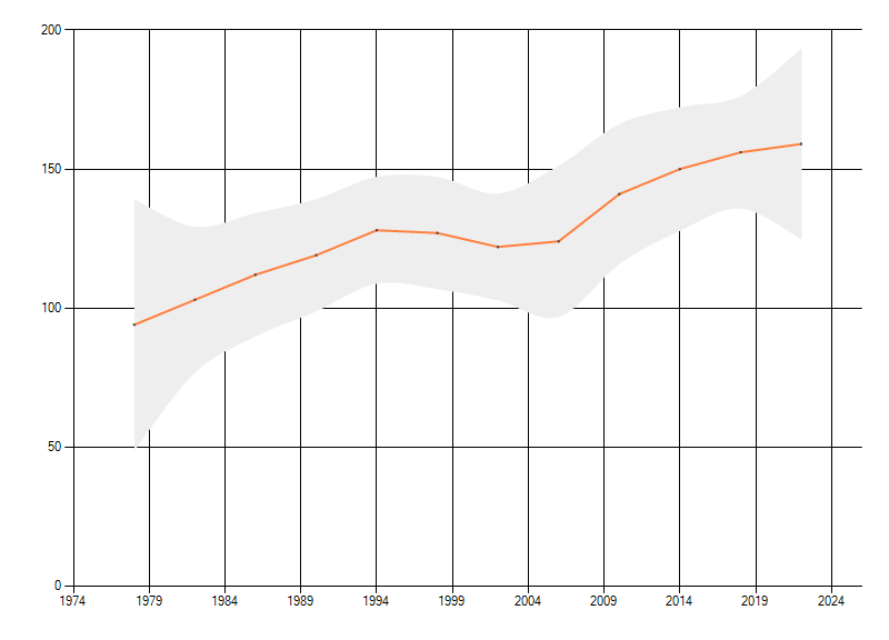 Gemiddelde trend van het aantal kilometerhokken waarin de soort voorkomt, weergegeven als indexcijfer (1975-1978 = 100). De trend is gecorrigeerd voor waarnemersinspanning en geeft de relatieve verandering in het aantal bezette kilometerhokken weer. Voor de berekening worden de data per periode van vier jaar samengenomen. In de grafiek correspondeert ieder punt met het laatste jaar van zo'n periode.
