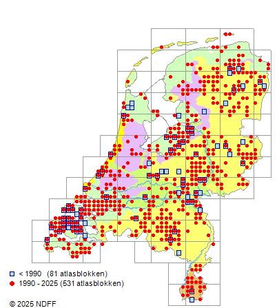 Het aantal atlasblokken (5x5 km) waarin de soort is gemeld binnen een periode van vijf jaar (vanaf 1980) of twintig jaar.