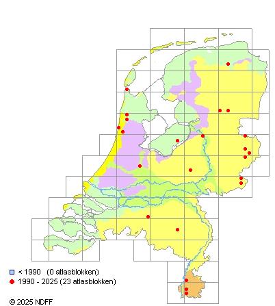 Het aantal atlasblokken (5x5 km) waarin de soort is gemeld binnen een periode van vijf jaar (vanaf 1980) of twintig jaar. Niet gecorrigeerd voor waarnemersinspanning en het aantal doorgegeven waarnemingen kan sterk variëren per periode, dus een trend in verspreiding kan hier niet direct uit worden afgelezen. Het opgegeven jaartal is het eerste jaar van de periode. Bron: gevalideerde waarnemingen uit de NDFF.