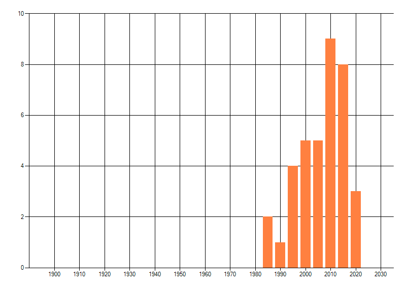 Het aantal atlasblokken (5x5 km) waarin de soort is gemeld binnen een periode van vijf jaar (vanaf 1980) of twintig jaar. Niet gecorrigeerd voor waarnemersinspanning en het aantal doorgegeven waarnemingen kan sterk variëren per periode, dus een trend in verspreiding kan hier niet direct uit worden afgelezen. Het opgegeven jaartal is het eerste jaar van de periode. Bron: gevalideerde waarnemingen uit de NDFF.
