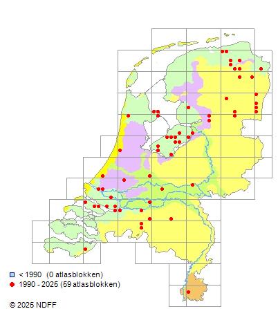 Het aantal atlasblokken (5x5 km) waarin de soort is gemeld binnen een periode van vijf jaar (vanaf 1980) of twintig jaar. Niet gecorrigeerd voor waarnemersinspanning en het aantal doorgegeven waarnemingen kan sterk variëren per periode, dus een trend in verspreiding kan hier niet direct uit worden afgelezen. Het opgegeven jaartal is het eerste jaar van de periode. Bron: gevalideerde waarnemingen uit de NDFF.