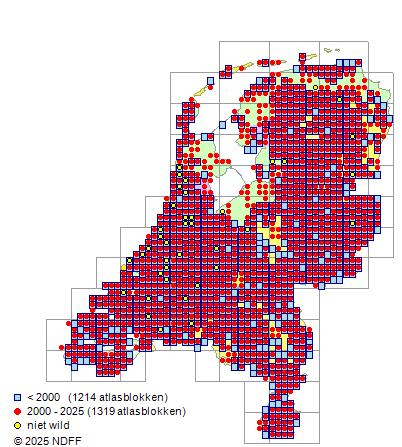 CC BY-NC-SA 3.0 NLVerspreidingNederlandVrij algemeen, maar vrij zeldzaam in Zuid-Limburg en zeldzaam in Flevoland, de zeekleigebieden, op de Veluwe en in de Peel.