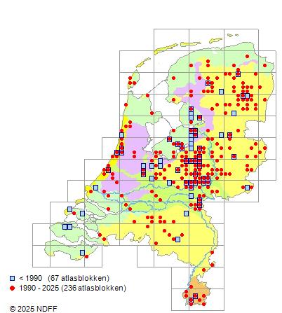 Het aantal atlasblokken (5x5 km) waarin de soort is gemeld binnen een periode van vijf jaar (vanaf 1980) of twintig jaar. Niet gecorrigeerd voor waarnemersinspanning en het aantal doorgegeven waarnemingen kan sterk variëren per periode, dus een trend in verspreiding kan hier niet direct uit worden afgelezen. Het opgegeven jaartal is het eerste jaar van de periode. Bron: gevalideerde waarnemingen uit de NDFF.