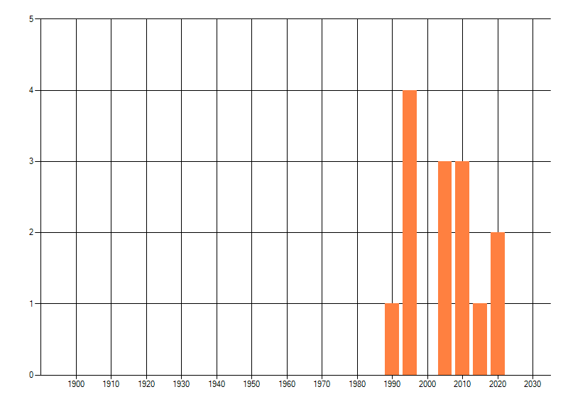Het aantal atlasblokken (5x5 km) waarin de soort is gemeld binnen een periode van vijf jaar (vanaf 1980) of twintig jaar. Niet gecorrigeerd voor waarnemersinspanning en het aantal doorgegeven waarnemingen kan sterk variëren per periode, dus een trend in verspreiding kan hier niet direct uit worden afgelezen. Het opgegeven jaartal is het eerste jaar van de periode. Bron: gevalideerde waarnemingen uit de NDFF.