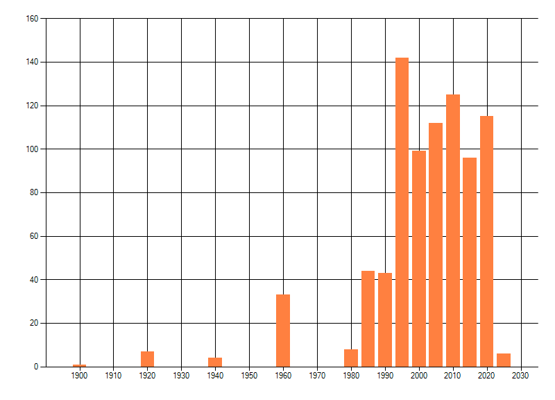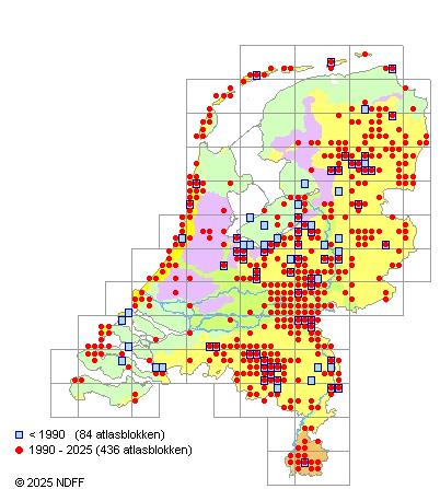 Het aantal atlasblokken (5x5 km) waarin de soort is gemeld binnen een periode van vijf jaar (vanaf 1980) of twintig jaar. Niet gecorrigeerd voor waarnemersinspanning en het aantal doorgegeven waarnemingen kan sterk variëren per periode, dus een trend in verspreiding kan hier niet direct uit worden afgelezen. Het opgegeven jaartal is het eerste jaar van de periode. Bron: gevalideerde waarnemingen uit de NDFF.