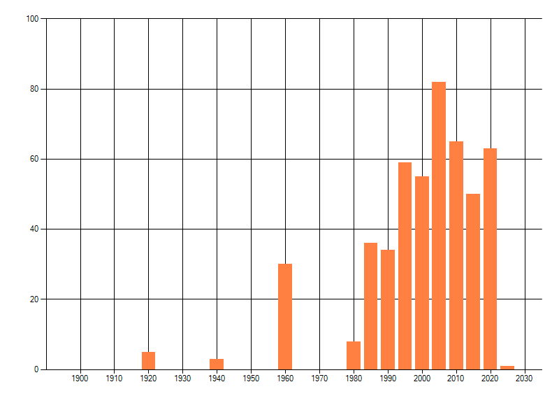 Het aantal atlasblokken (5x5 km) waarin de soort is gemeld binnen een periode van vijf jaar (vanaf 1980) of twintig jaar. Niet gecorrigeerd voor waarnemersinspanning en het aantal doorgegeven waarnemingen kan sterk variëren per periode, dus een trend in verspreiding kan hier niet direct uit worden afgelezen. Het opgegeven jaartal is het eerste jaar van de periode. Bron: gevalideerde waarnemingen uit de NDFF.