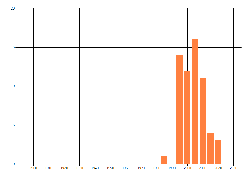 Het aantal atlasblokken (5x5 km) waarin de soort is gemeld binnen een periode van vijf jaar (vanaf 1980) of twintig jaar. Niet gecorrigeerd voor waarnemersinspanning en het aantal doorgegeven waarnemingen kan sterk variëren per periode, dus een trend in verspreiding kan hier niet direct uit worden afgelezen. Het opgegeven jaartal is het eerste jaar van de periode. Bron: gevalideerde waarnemingen uit de NDFF.