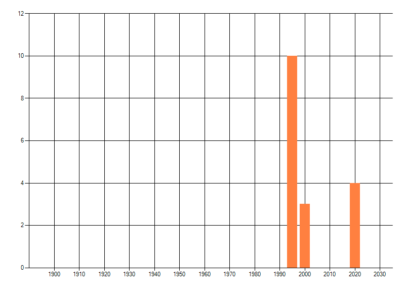 Het aantal atlasblokken (5x5 km) waarin de soort is gemeld binnen een periode van vijf jaar (vanaf 1980) of twintig jaar. Niet gecorrigeerd voor waarnemersinspanning en het aantal doorgegeven waarnemingen kan sterk variëren per periode, dus een trend in verspreiding kan hier niet direct uit worden afgelezen. Het opgegeven jaartal is het eerste jaar van de periode. Bron: gevalideerde waarnemingen uit de NDFF.
