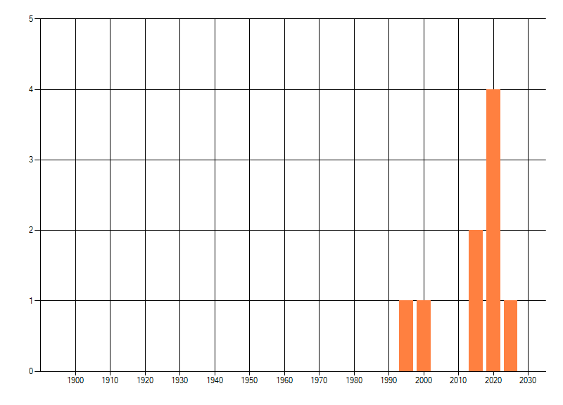 Het aantal atlasblokken (5x5 km) waarin de soort is gemeld binnen een periode van vijf jaar (vanaf 1980) of twintig jaar. Niet gecorrigeerd voor waarnemersinspanning en het aantal doorgegeven waarnemingen kan sterk variëren per periode, dus een trend in verspreiding kan hier niet direct uit worden afgelezen. Het opgegeven jaartal is het eerste jaar van de periode. Bron: gevalideerde waarnemingen uit de NDFF.