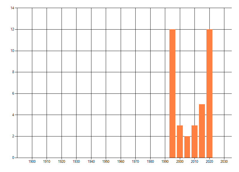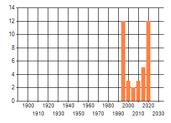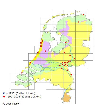 Het aantal atlasblokken (5x5 km) waarin de soort is gemeld binnen een periode van vijf jaar (vanaf 1980) of twintig jaar. Niet gecorrigeerd voor waarnemersinspanning en het aantal doorgegeven waarnemingen kan sterk variëren per periode, dus een trend in verspreiding kan hier niet direct uit worden afgelezen. Het opgegeven jaartal is het eerste jaar van de periode. Bron: gevalideerde waarnemingen uit de NDFF.