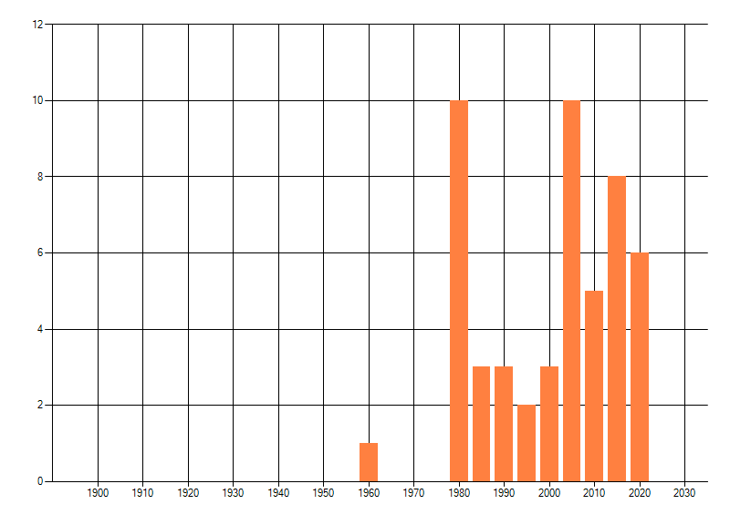 Het aantal atlasblokken (5x5 km) waarin de soort is gemeld binnen een periode van vijf jaar (vanaf 1980) of twintig jaar. Niet gecorrigeerd voor waarnemersinspanning en het aantal doorgegeven waarnemingen kan sterk variëren per periode, dus een trend in verspreiding kan hier niet direct uit worden afgelezen. Het opgegeven jaartal is het eerste jaar van de periode. Bron: gevalideerde waarnemingen uit de NDFF.
