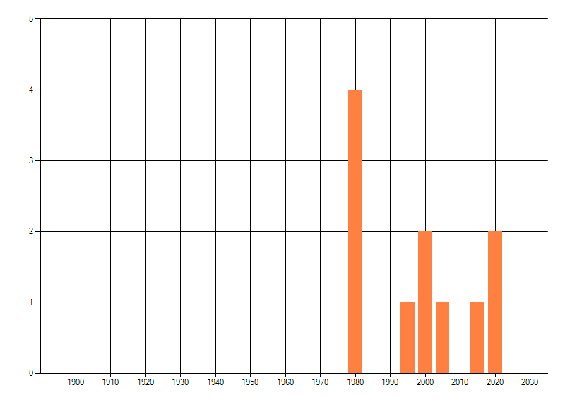 Het aantal atlasblokken (5x5 km) waarin de soort is gemeld binnen een periode van vijf jaar (vanaf 1980) of twintig jaar. Niet gecorrigeerd voor waarnemersinspanning en het aantal doorgegeven waarnemingen kan sterk variëren per periode, dus een trend in verspreiding kan hier niet direct uit worden afgelezen. Het opgegeven jaartal is het eerste jaar van de periode. Bron: gevalideerde waarnemingen uit de NDFF.