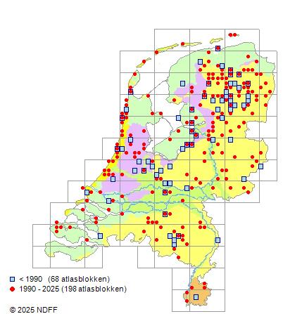 Het aantal atlasblokken (5x5 km) waarin de soort is gemeld binnen een periode van vijf jaar (vanaf 1980) of twintig jaar. Niet gecorrigeerd voor waarnemersinspanning en het aantal doorgegeven waarnemingen kan sterk variëren per periode, dus een trend in verspreiding kan hier niet direct uit worden afgelezen. Het opgegeven jaartal is het eerste jaar van de periode. Bron: gevalideerde waarnemingen uit de NDFF.