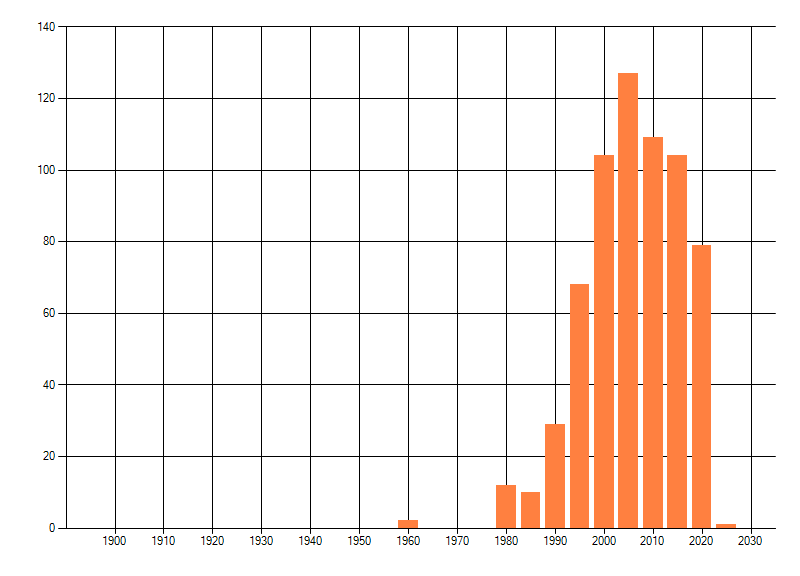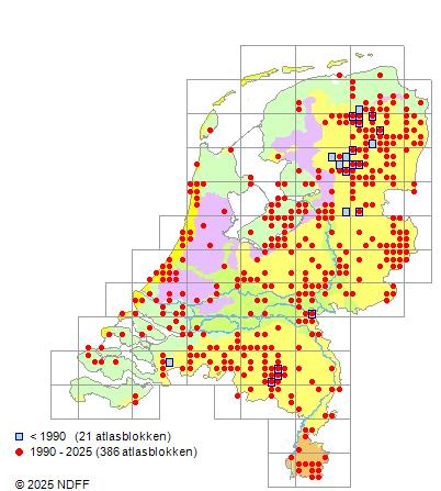 Het aantal atlasblokken (5x5 km) waarin de soort is gemeld binnen een periode van vijf jaar (vanaf 1980) of twintig jaar. Niet gecorrigeerd voor waarnemersinspanning en het aantal doorgegeven waarnemingen kan sterk variëren per periode, dus een trend in verspreiding kan hier niet direct uit worden afgelezen. Het opgegeven jaartal is het eerste jaar van de periode. Bron: gevalideerde waarnemingen uit de NDFF.