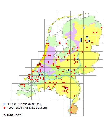 Het aantal atlasblokken (5x5 km) waarin de soort is gemeld binnen een periode van vijf jaar (vanaf 1980) of twintig jaar. Niet gecorrigeerd voor waarnemersinspanning en het aantal doorgegeven waarnemingen kan sterk variëren per periode, dus een trend in verspreiding kan hier niet direct uit worden afgelezen. Het opgegeven jaartal is het eerste jaar van de periode. Bron: gevalideerde waarnemingen uit de NDFF.